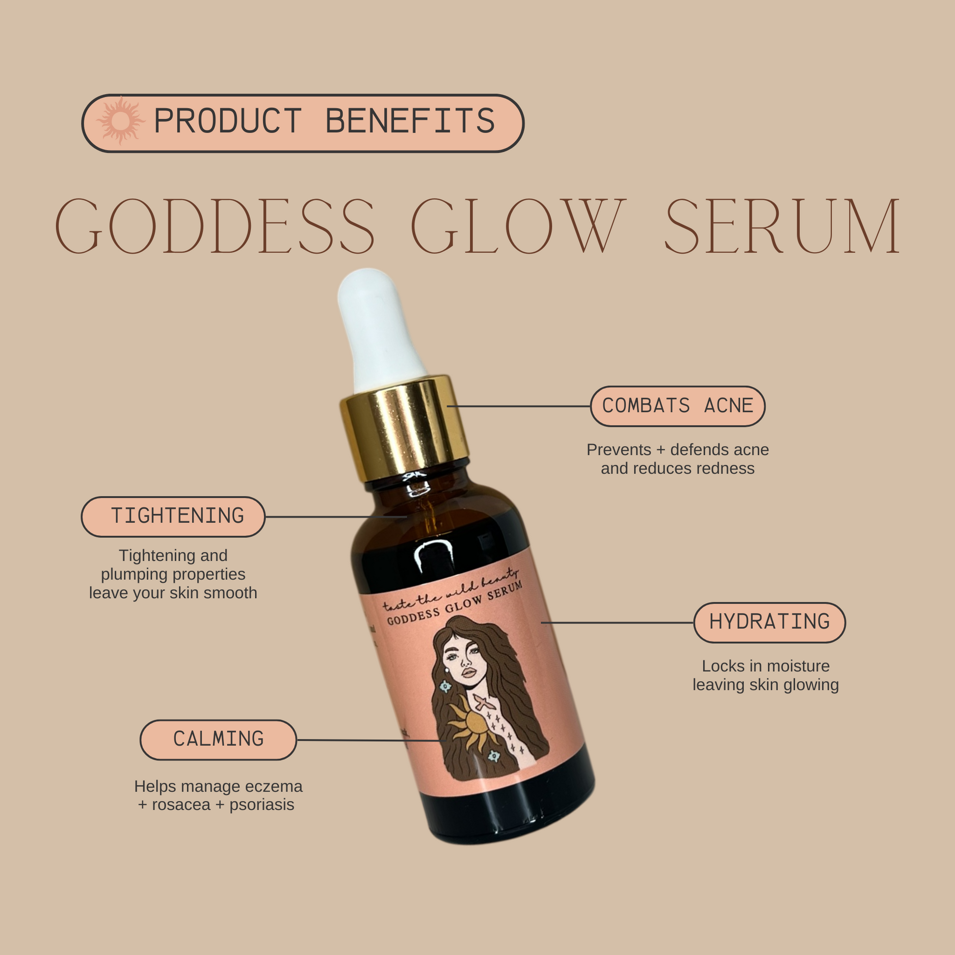 The goddess glow serum is antibacterial + anti inflammatory and is going to absolutely crush breakouts + redness + spots while nature works its magic in aging gracefully. This serum is incredibly hydrating and will have your skin looking flawless. Sold in a 1 oz. glass dropper bottle. For best results, pair with Taste the Wild Beauty youth serum.